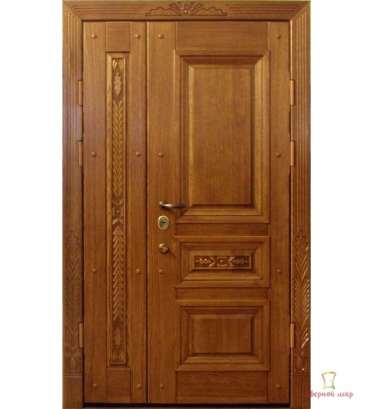 Каркас полотна складається з гнутого профілю, виготовленого з 2-х мм сталі. Полотно має лицьовий лист металу товщиною 2 мм і три П-подібні ребра жорсткості, що робить двері непідвладними механічним впливам ззовні. Каркас полотна покривається декоративними накладками з ясена та інших порід натурального дерева товщиною 16 мм. Усередині полотно утеплюється теплоізолятором IZOTOPRAK. Це робить наші двері звуко- та теплоізоляційними.